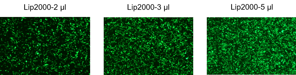 使用不同量的 GenStar#C105(2 μl、3μl、5μl),將1 μg質粒DNA轉染293T細胞。結果顯示,在推薦使用量范圍內,加大轉染試劑量可提高轉染效率。