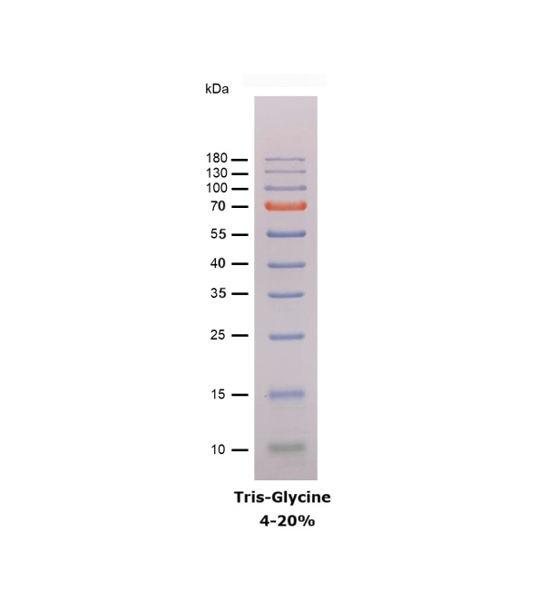 本產品由跨度從 10-180 kDa 的 10 種高度純化預染的重組蛋白質組成。其中 10 kDa 條帶為綠色預染條帶,70 kDa 條帶為紅色預染條帶,方便判斷各個條帶的準確位置。本產品適合作為 SDS-PAGE 電泳時,變性蛋白樣品的分子量參照,并可實時觀察蛋白樣品的電泳分離狀況,也可用于檢測 Western blot 的轉膜效率。由于共價結合的染料會影響蛋白質分子的電泳遷移率,本產品僅適于粗略地估計目的蛋白樣品的分子量。